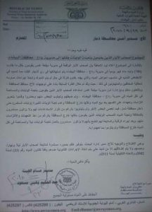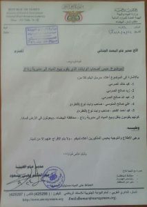The Yemeni Press Agency got a memorandum issued by the General Authority for Water Resources in the province of Dhamar-Bayda, on September 24, confirming the deposit of 5 owners of wells and drivers of water tankers from Mifat-Ans district to the Criminal Investigation Department in the province against the backdrop of waste and depletion water Basin of Dhamar and sold to irrigate Qat farms in t Rada’a district of Bayda after depleted groundwater there.