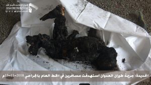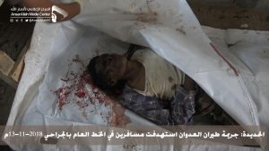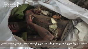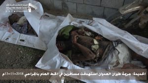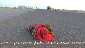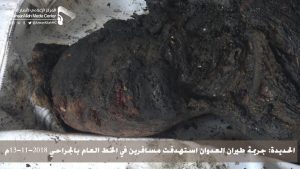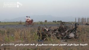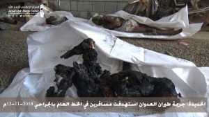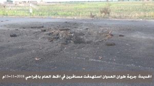 HODEIDAH, Nov. 13 (YPA) – Ansarallh Media Center on Tuesday distributed several photos of Tuesday’s crime committed by Saudi-led coalition’s warplanes against passengers on the main highway of Jarahi district, which left 9 people killed and two wounded.