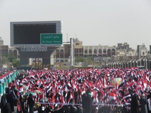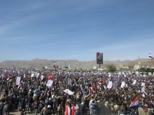 In the central mass event at Al-Sabeen Square, which witnessed a remarkable women presence, the participants raised the flag of the Republic of Yemen and banners confirming the continual steadfastness and challenge in the face of the barbaric aggression and inaugurating a fifth year that seems filled with harsh surprises for the aggression coalition countries.
