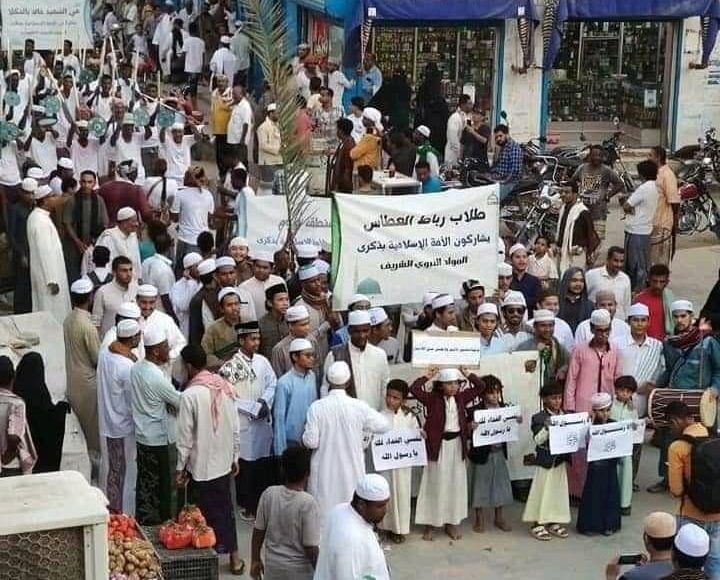 HADRAMOUT, Oct. 18 (YPA) – Thousands of people in Hadramout province took on Monday to the streets of al-Mukalla city to celebrate the anniversary of Mawlid al-Nabi al-Sharif, “the birth of Prophet, Mohammed.”