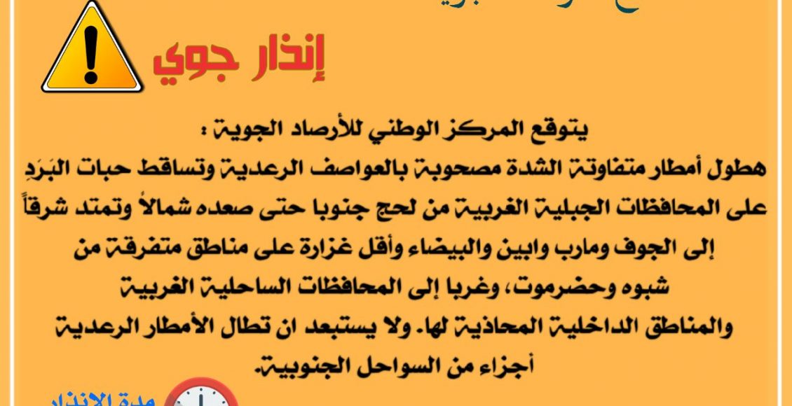 In its forecast, the center expected rain of varying intensity, accompanied by thunderstorms, from Lahj in the south until Saada in the north, as well as to Jawf, Marib, Abyan, Shabwa, Hadramout, and Bayda.